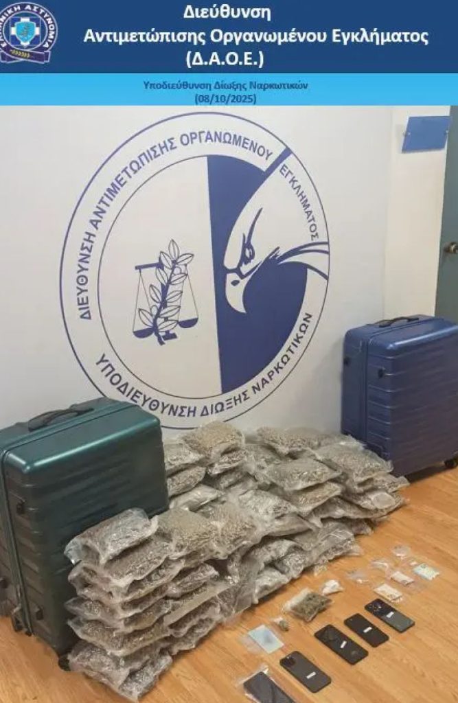 Από την Υποδιεύθυνση Δίωξης Ναρκωτικών της Διεύθυνσης Αντιμετώπισης Οργανωμένου Εγκλήματος, συνελήφθησαν απογευματινές ώρες της Τρίτης 7 Οκτωβρίου 2025, 4 άτομα (3 ημεδαποί ηλικίας 27, 35 και 21 ετών και 19χρονος αλλοδαπός), μέλη διεθνικής εγκληματικής ομάδας, που δραστηριοποιούνταν στην εισαγωγή ακατέργαστης κάνναβης υδροπονικής καλλιέργειας (skunk) στην ελληνική επικράτεια.