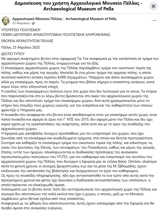 Μετά τις αντιδράσεις, η Εφορεία Αρχαιοτήτων Πέλλας απάντησε δημόσια, μέσω της επίσημης σελίδας της στο Facebook.
