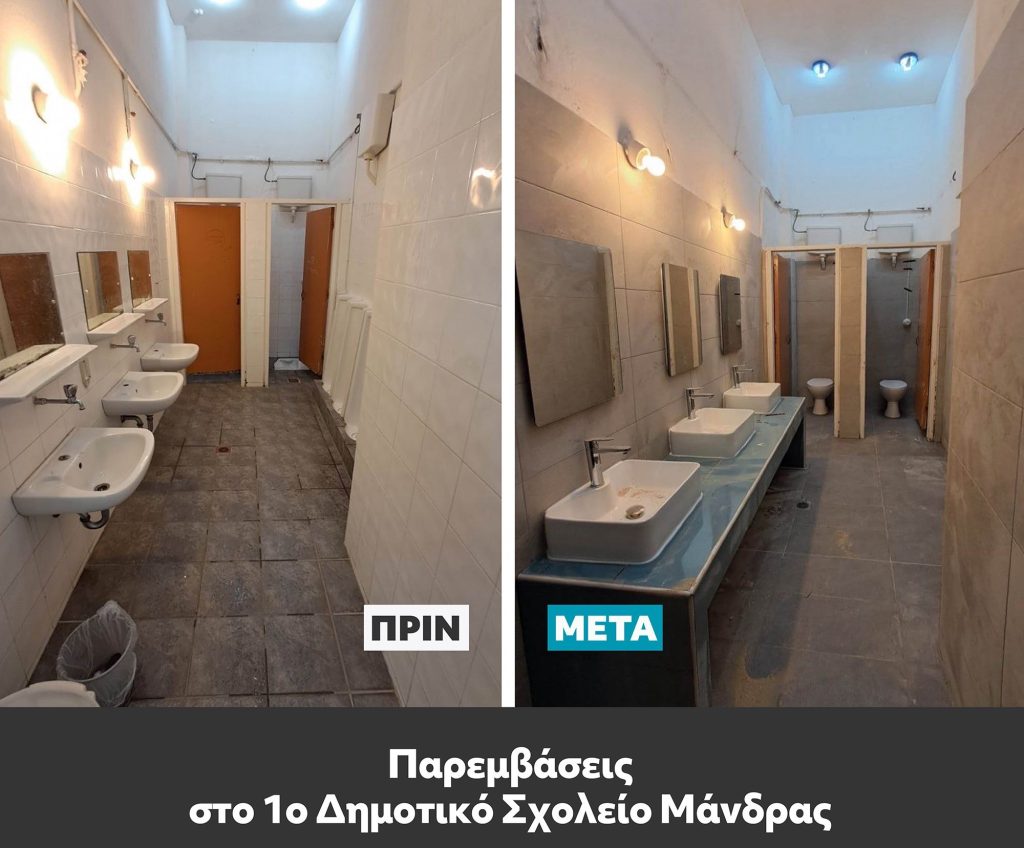 Παράλληλα, σε συνεργασία με τον Σύλλογο Γονέων & Κηδεμόνων του 1ου Δημοτικού Σχολείου, πραγματοποιήθηκε πλήρης ανακαίνιση στους χώρους υγιεινής του σχολείου, οι οποίοι παρουσίαζαν εικόνα εκτεταμένης φθοράς και σαράντα και πλέον χρόνια δεν είχαν δεχθεί ουσιαστική αναβάθμιση. Οι εργασίες περιέλαβαν συνολική αντικατάσταση υποδομών και βελτίωση της λειτουργικότητας των εγκαταστάσεων, ώστε να ανταποκρίνονται στις σημερινές ανάγκες της σχολικής κοινότητας.